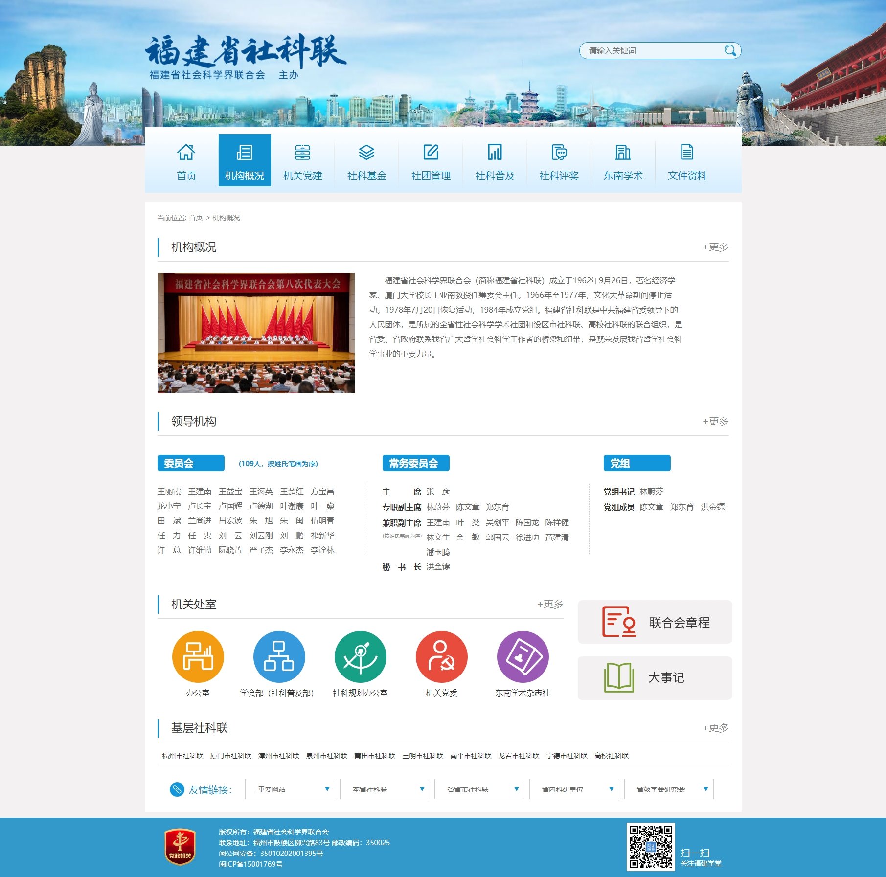 福建省社会科学界联合会(简称福建省社科联)成立于1962年9月26日,著名经济学家、厦门大学校长王亚南教授任筹委会主任。1966年至1977年,文化大革命期间停止活动。1978年7月20日恢复活动,1984年成立党组。福建省社科联是中共福建省委领导下的人民团体,是所属的全省性社会科学学术社团和设区市社科联、高校社科联的联合组织,是省委、省政府联系我省广大哲学社会科学工作者的桥梁和纽带,是繁荣发展我省哲学社会科学事业的重要力量。